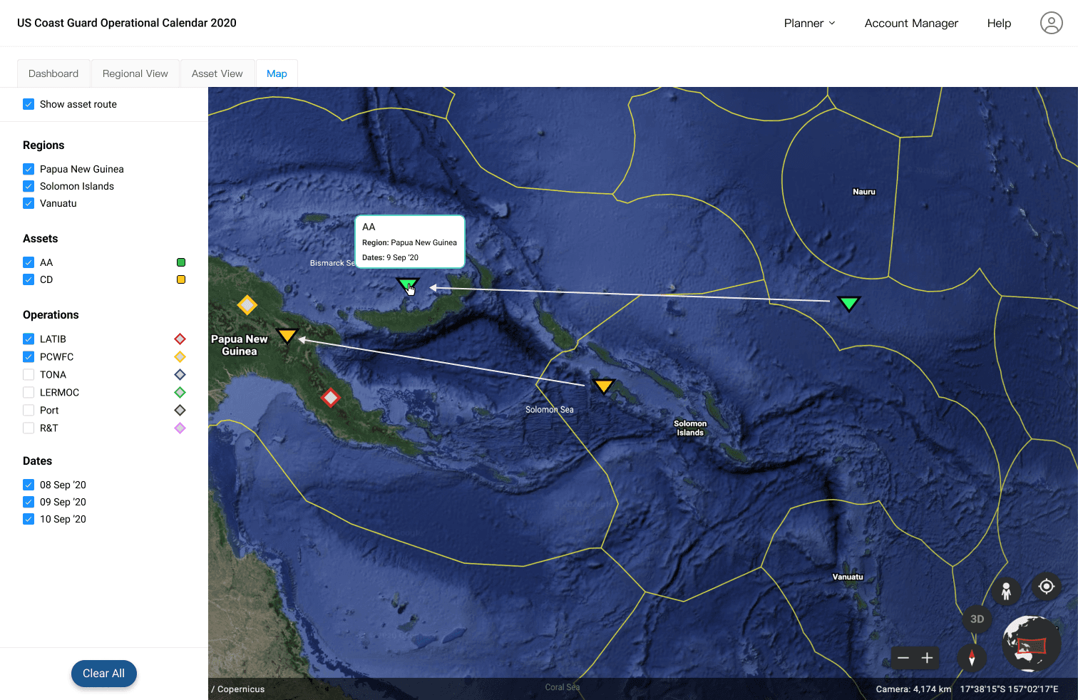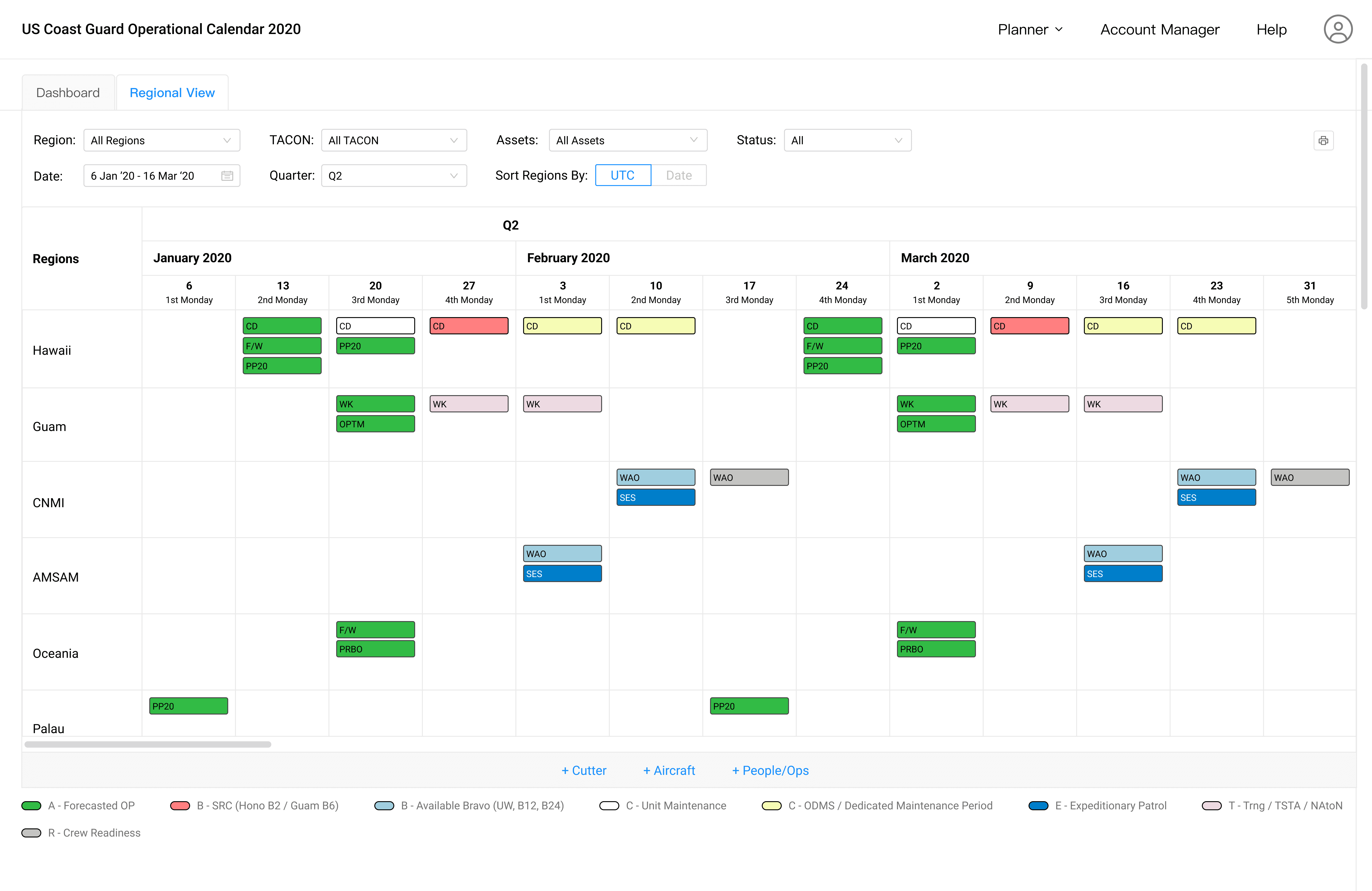 Planners are able to visually see planned mission happening across various regions throughout the whole year to help with planning and coordination across distributed teams.
