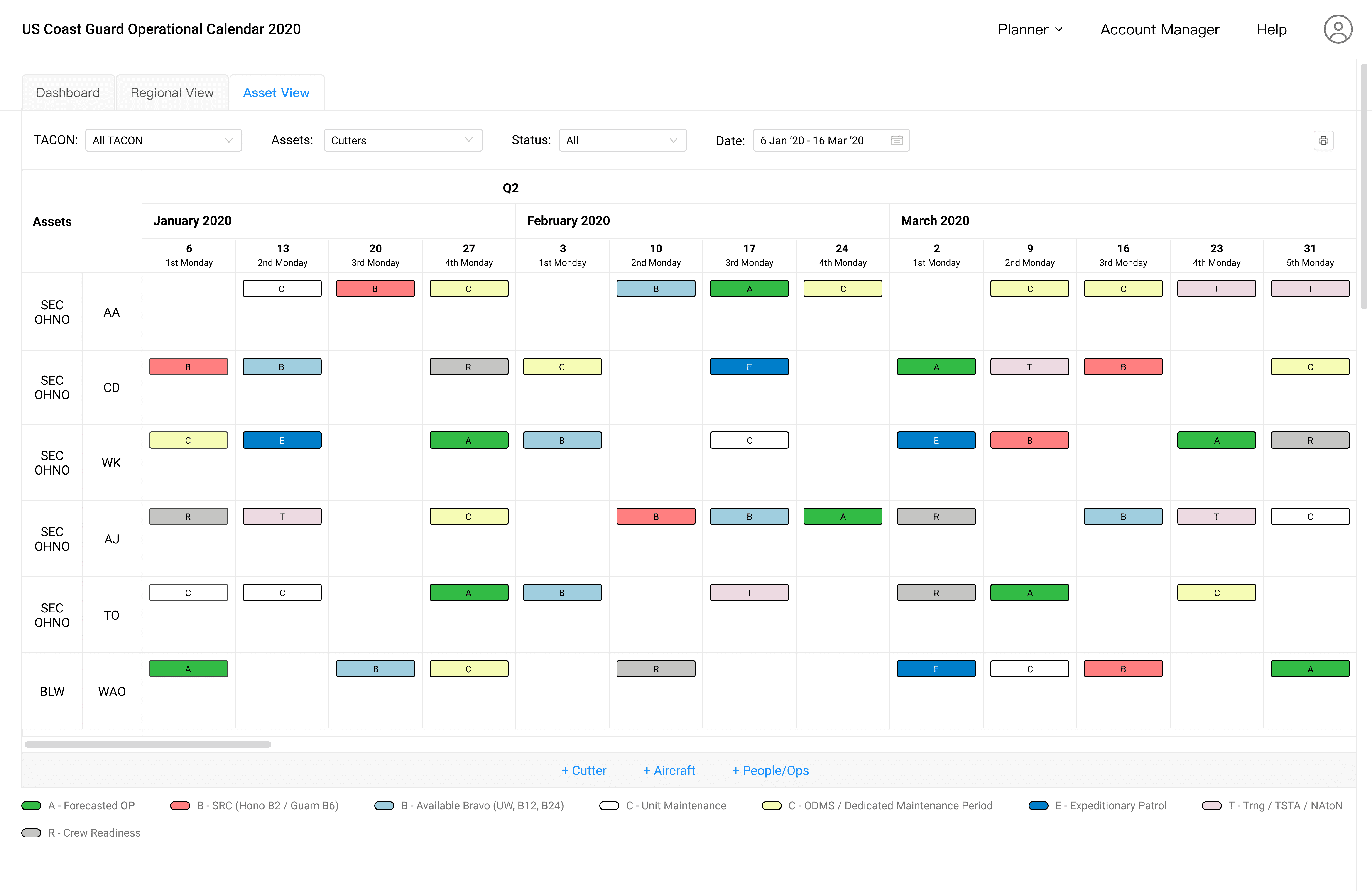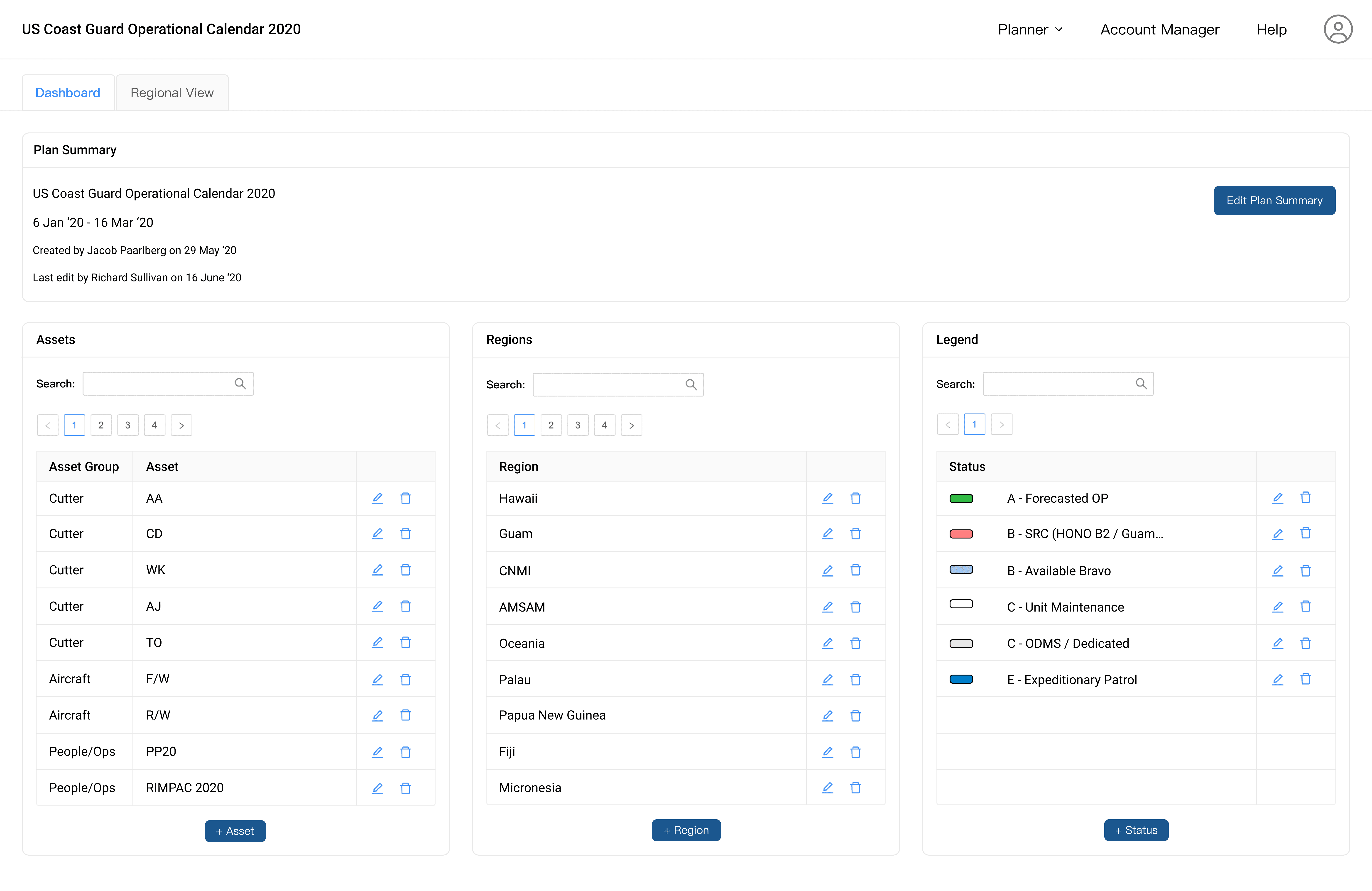Multiple planners can now view and add assets (cutters, aircrafts, people/operations, etc.), regions the assets will reside in, and the asset status involved in a mission plan.